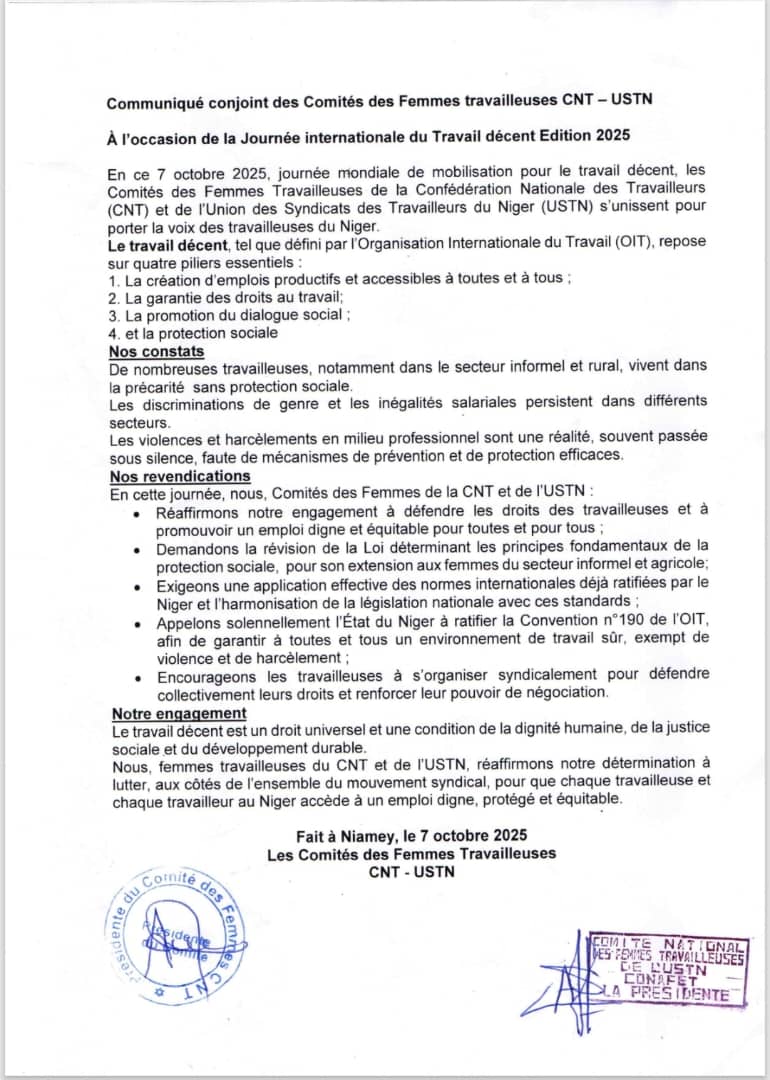 Niamey, 7 octobre 2025 — À l’occasion de la Journée internationale du Travail décent, les comités des femmes travailleuses de la CNT et de l’USTN ont parlé d’une même voix pour défendre les droits des travailleuses du Niger.