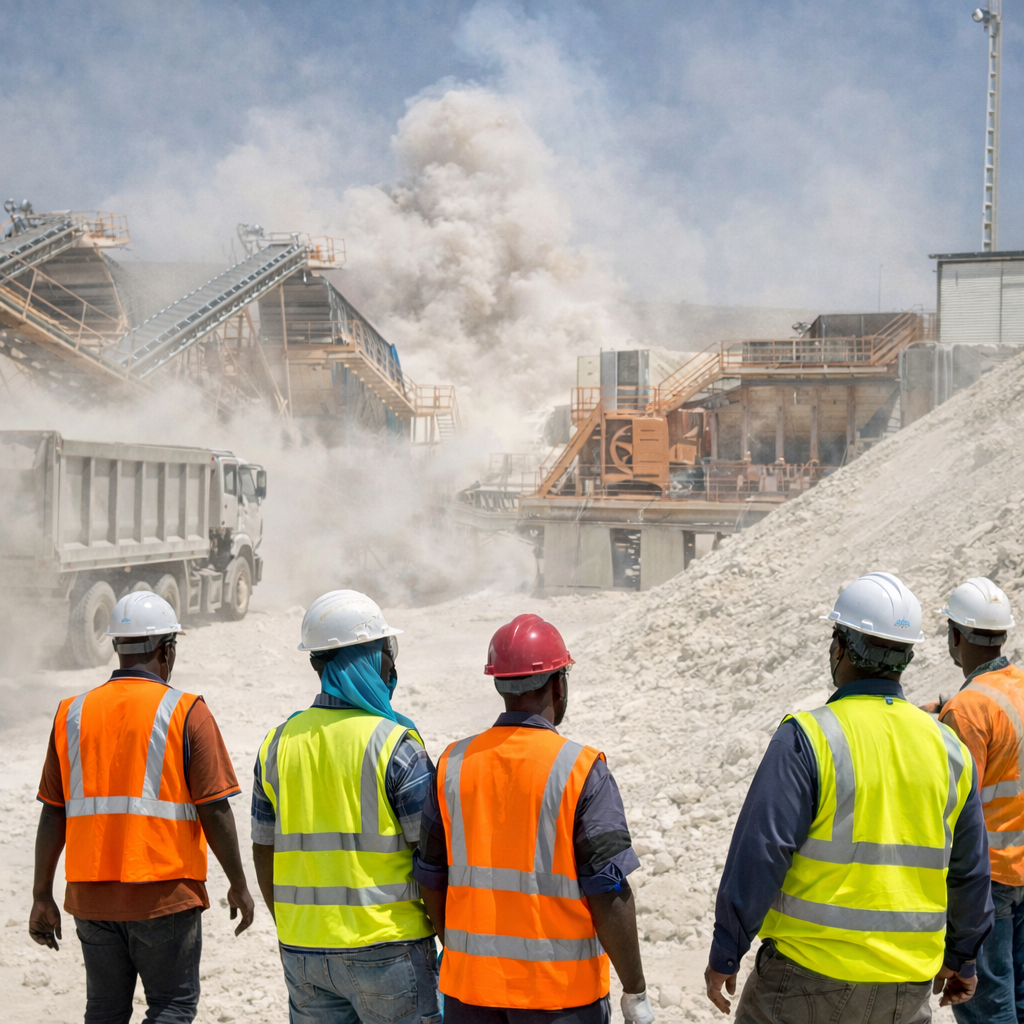 Dans la carrière des explosions régulières ont lieu afin d'extraire les matériaux, libérant des particules qui se diffusent dans l'air. Les allées et venues constantes des camions lourds génèrent une poussière permanente. Cette exposition à la poussière industrielle et aux substances nocives affecte directement la santé des travailleurs, sans que les mesures de prévention et de protection soient suffisamment prises en compte.